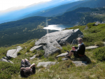 Hütte Damjanica (1800 m) - Tevnoto-See (2515 m) mit gleichnamiger Hütte (wieder auf dem E4)Etwa 10 km, 3 h, leicht, toll und eine echte Ausruhtour Das mit dem Ausruhen haben wir uns natürlich ausgedacht – vor vielen Jahren. Von der Demjanica tappen wir – immer hübsch bergauf - bis kurz vor den Pass. Unterwegs gibt es Unmengen von Blaubeeren und man kann hier einen ganz besonderen Thymian sammeln, den es nur im Pirin gibt. (Als Tee besonders gut gegen Husten – schwören die Bulgaren.) An den herrlichen Gebirgsseen kann man nicht einfach vorbei gehen. Hier lassen wir uns nieder und machen einen Lesetag, um am späten Nachmittag den letzten kleinen, aber Eindruck hinterlassenden Aufstieg zu nehmen und gelangen nach einer knappen Stunde an die beeindruckendste Hütte: Eingekreist von hohen Bergen liegt sie so einsam und hoch, dass nach Sonnenuntergang auf dem Thermometer zugesehen werden kann, wie die Temperatur in Windeseile gen Null fällt. Weit weg von der Zivilisation bietet sich dem Wanderer hier ein gigantischer Sternenhimmel. Selbst die Milchstraße scheint zum Greifen nah. Betrieben wird die Hütte von einem jungen Paar, das sehr beweglich ist und eine ausgesprochen gute Küche bietet (obwohl alles per Pferd zur Hütte hinauf transportiert werden muss!). Neben einem Gemeinschaftsschlafsaal (ca. 30 Personen) gibt es neuerdings an der Rückseite der Hütte zwei „Bungalows“: ganz einfache, aber einladende Holzhüttchen für bis zu acht Personen (je vier Doppelstockbetten).